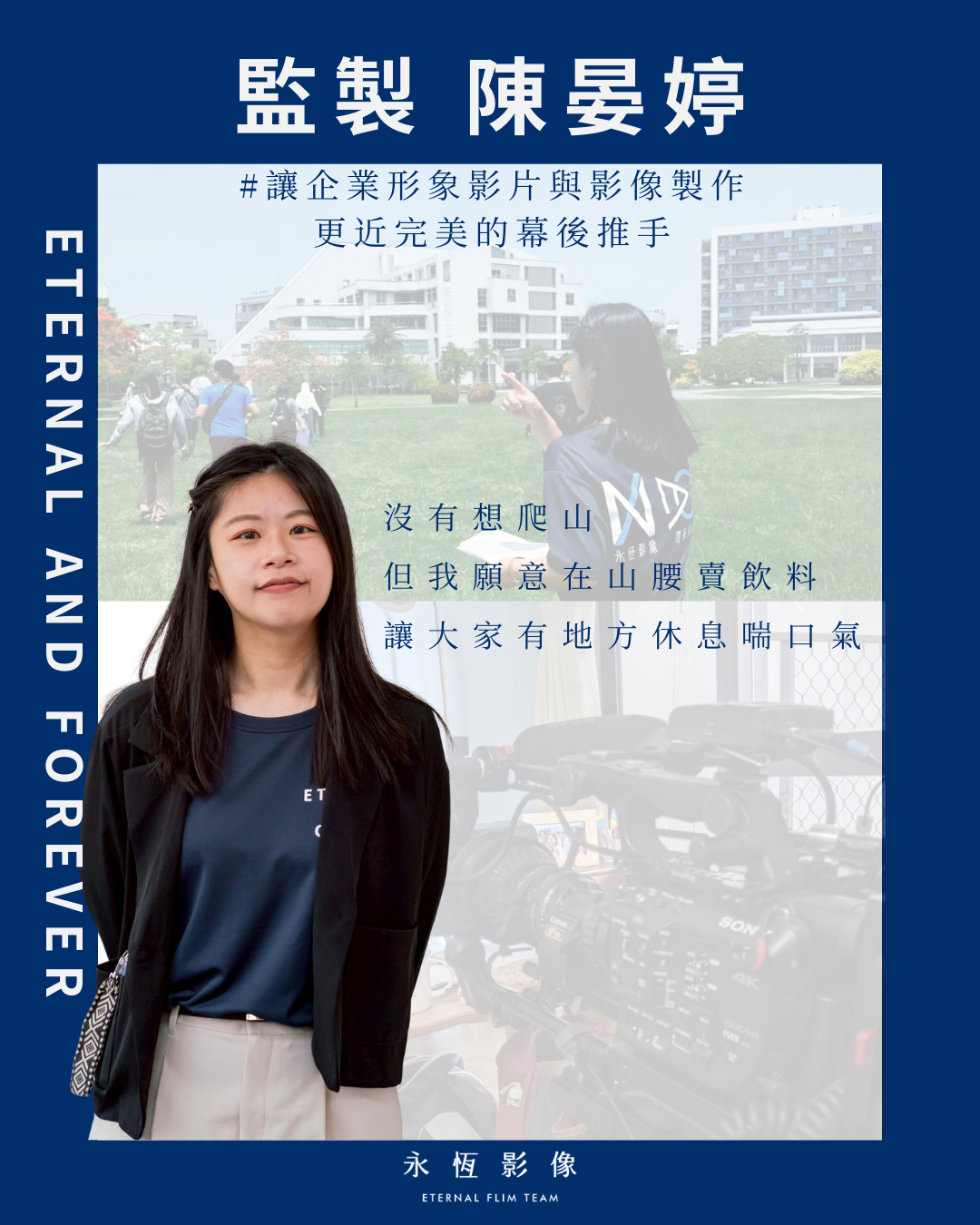 五年前,晏婷誤打誤撞踏進影視產業,成為永恆影像製作工作室的重要成員。非本科出身的她,從未預想過會走上這條路,但憑著對影像製作的熱情,以及對企業形象影片製作和尾牙影片製作等各類專案的嚴謹態度,她選擇了留下。